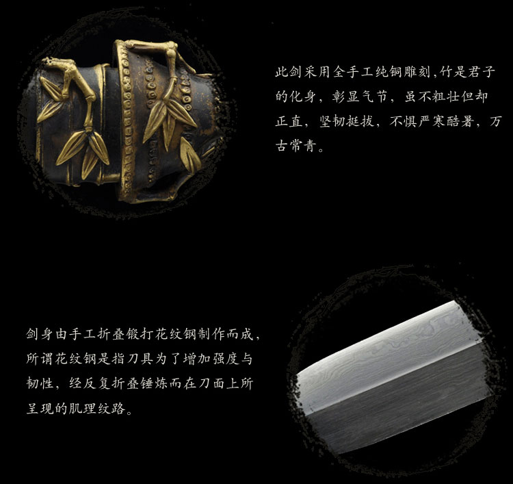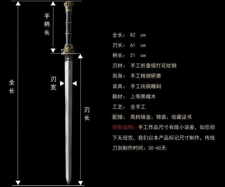 每一位武者都希望有一柄纯手工的兵器,这把剑做的很满意,刻字也很漂亮,花纹很美丽,运送包装都非常好。感谢!