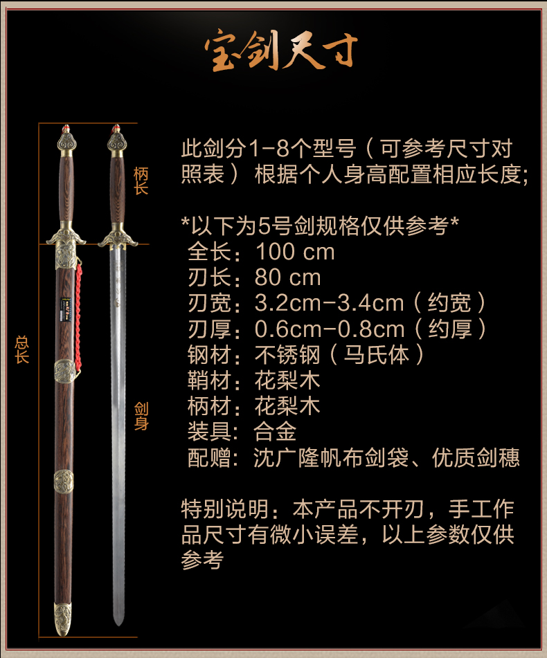 我定了两把刻名字的。剑柄和剑鞘颜色比图片浅。剑的手感很好,柔中带刚。物流也很给力。明早让拳友们瞜瞜去